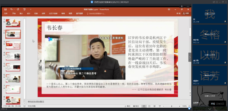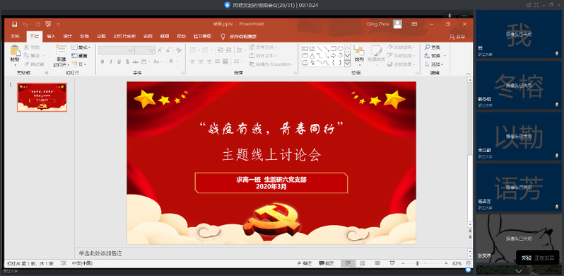 讨论会第一项,由支部书记周晴主持,两位支部委员郑琦、张奕玮分别围绕战疫人物事迹和文明素养两个方面展开微党课。