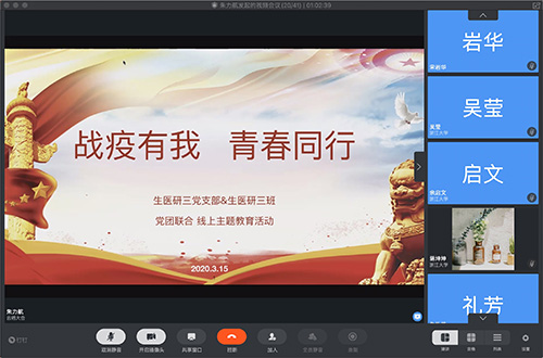 为深入贯彻习近平总书记重要指示精神和上级有关部门的决策部署,积极落实学院疫情防控工作,更好地引导广大学生积极抗击疫情,生医研三党支部联合生医三班,于2020年3月15日下午组织生医研三支部全体党员以及生医三班全体成员,开展了主题为“战疫有我,青春同行”的线上党团联合主题教育大会,会议采用钉钉线上视频的形式。本次会议邀请到了生医三班德育导师陈星老师,由生医研三党支部书记朱力航主持。