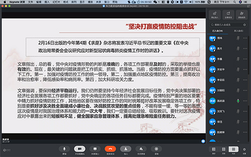本次会议借助信息化手段,采用钉钉线上视频的方式,以“一党员一党课”与“战疫有我,青春同行”主题教育为两个着力点,充分结合党团联动的活动形式,充分落实了学院进一步开展“三会一课”的要求,将“三会一课”与学校双一流建设,学院人才培养以及同学们自身的成长成才结合了起来。本次的线上直播会议,温馨而有序,这也是一种线上会议方式的新尝试与挑战。在这特殊的疫情时期里,经过本次线上主题教育大会的学习,同学们深受感染和鼓舞,纷纷向奋战在第一线的英雄们致敬,相信艰难的日子终将迎来曙光!