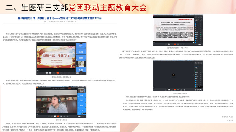 2020年3月26日上午,生仪学院学生党支部书记3月工作例会以浙大钉视频会议的形式召开。学院团委书记孙幼波老师主持会议,生仪学院党委副书记杨扬、兼职辅导员曹野、潘思红和各学生党支部书记参加会议。会议就当前新冠病毒肺炎疫情防控形势下有效开展党支部建设展开讨论。