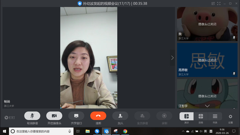 2020年3月26日上午,生仪学院学生党支部书记3月工作例会以浙大钉视频会议的形式召开。学院团委书记孙幼波老师主持会议,生仪学院党委副书记杨扬、兼职辅导员曹野、潘思红和各学生党支部书记参加会议。会议就当前新冠病毒肺炎疫情防控形势下有效开展党支部建设展开讨论。