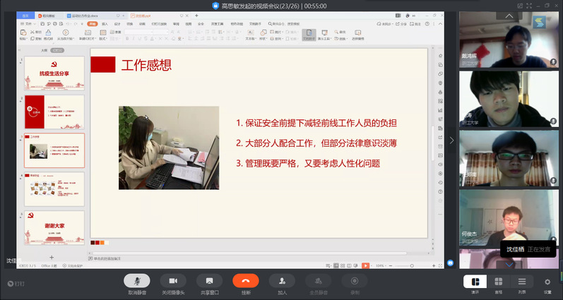 会议最后一项是党支部宣传委员沈佳栖以抗疫生活分享为主题的微党课,沈佳栖同学通过自己的切身感受,介绍了在疫情防控志愿者期间的经历和感想。对于我们每个共产党员来说。在疫情期间,做好个人的防护工作,为周围的人提供防疫知识、做出榜样是基本的,是必须做到的。另外,通过自己的工作和贡献为国家防疫尽自己的绵薄之力也应是每个党员应该学习的,应该提倡的。