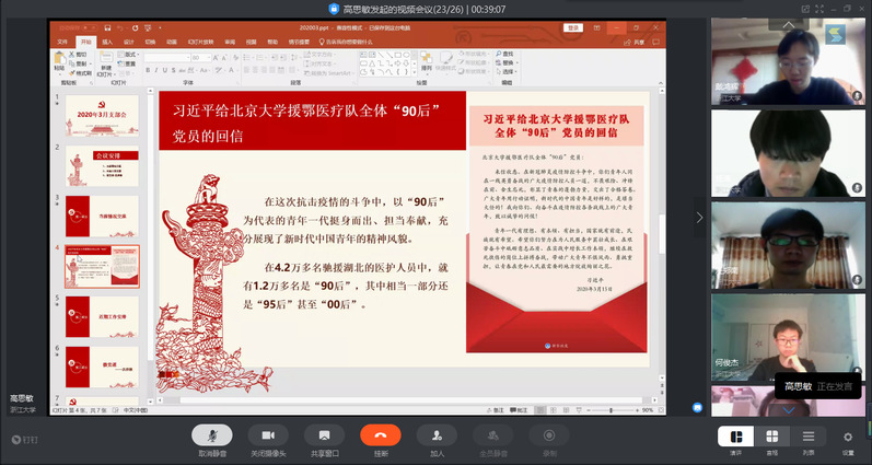 首先,党支部同学们积极分享了在疫情期间的学习和生活情况。在隔离好自己的前提下,同学们仍不放松自己的学业,以多种多样的形式丰富自己的居家生活。其中还有一部分学生在疫情期间,积极加入防疫志愿者工作,为抗击疫情做出贡献。支部党员学习了以北京大学援鄂医疗队全体90后党员为代表的同龄人党员的事迹。他们挺身而出,甘于奉献。正是因为有许许多多这样的优秀党员,他们用责任和担当为我们撑起了这蓝色的天空。