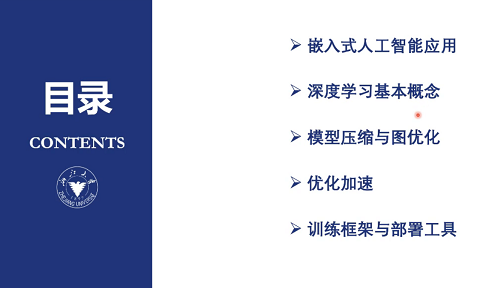 公开课第二个专题由郑楷学长分享。郑楷学长首先介绍了云服务的局限,引出嵌入式部署的对应优点,接着简单介绍了嵌入式的相应应用:自动驾驶、安防、AI相机、语音唤醒等。通过这些例子让参加公开课的同学形象且直接地体会到嵌入式AI的广泛应用。讲完应用,郑楷学长解释了深度学习的一些基本概念,作为后续的分享的基础。随着讲解内容不断深入,郑楷学长引出了模型压缩和图优化的相关操作,包括参数剪枝、参数共享(量化)、轻量化网络、知识蒸馏以及层融合。在模型优化加速部分,主要涉及了卷积计算策略和针对计算特性优化,内容难度进一步提高。最后,郑楷学长分析对比了目前主流的训练框架和部署工具,在框架和工具的选择上给大家提供了自己的一些建议。