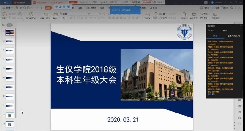 2020年3月21日,生仪学院2018年本科生年级大会在云端顺利举行,由于新冠病毒疫情的影响,本次大会采用钉钉群直播的形式进行,生仪学院副院长周泓老师,党委副书记杨扬老师,教学科科长齐炜老师,团委副书记王嘉忆老师,2018级兼职辅导员苏惜若、钱霖泽,优秀学长代表韩成阳、王肃杰、许冬冬、杨泽昆等参与本次大会。本次会议由2018级兼职辅导员苏惜若主持。