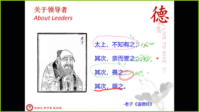 晚上的课程主题为“主动领导”,老师引用老子《道德经》中的话“太上,不知有之;其次,亲而誉之;其次,畏之;其次,辱之。”作为开场,从“德”、“高”、“望”、“重”四个角度向同学们讲解身为领导者必备的素养。想要成为一名优秀的领导者,我们需要擅于倾听、高瞻远瞩、学会以身作则、尊重他人,能够与伙伴保持建设性关系。