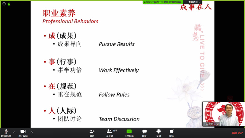 虽然受到疫情影响,同学们和老师只能通过摄像头线上沟通,但土豆老师授课有趣,通过观看视频、填写问卷、线上交流等丰富的形式与同学们有了充分的互动,课堂上干货满满,氛围活泼。相信同学们在本次活动之后对职场生活有了进一步了解,对如何做一名优秀的领导者有了更清晰的认识。