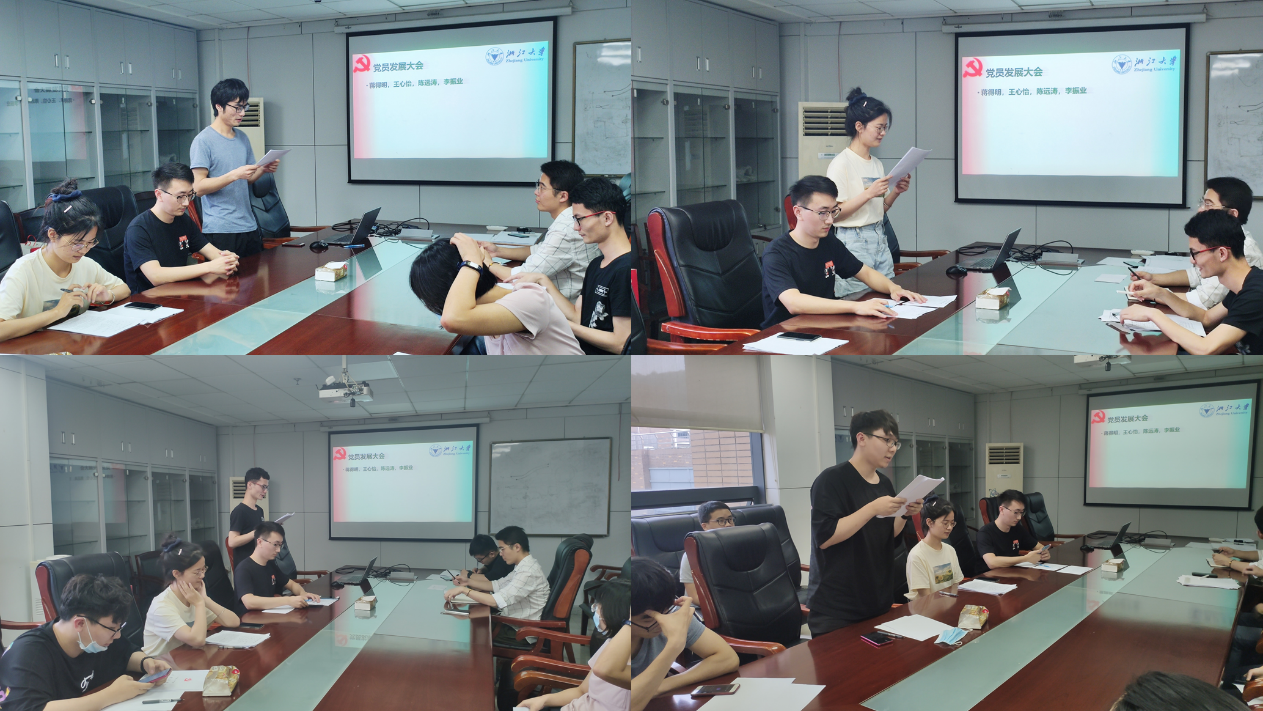 最后,党支部还召开了党员发展大会,讨论了蒋得明、王心怡、陈远涛、李振业四位同志的入党申请事宜,四名同志分别介绍了自身的基本情况、入党动机和对党的认识,入党介绍人和参会党员对各入党申请人发表了评价,指出了入党申请人的不足和今后需要进步的地方。最后经无记名投票方式,与会党员同志一致同意接收4名同志为中共预备党员。