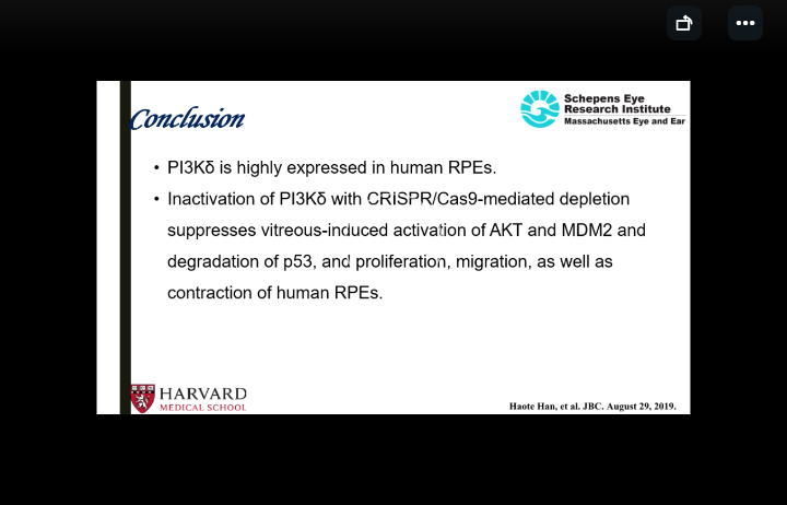 韩昊特同学是浙江大学生仪学院田景奎教授的博士研究生,2018年11月至2020年9月期间,荣获CSC国家公派留学联合培养博士生项目资助,在美国哈佛医学院 Schepens Eye Research Institute (SERI) 眼科研究所进行了接近两年的联合培养。在这两年中,她对CRISPR基因编辑技术有了较为全面的认识,学会构建CRISPR-Cas or dCas载体,并成功建立了多株基因敲除细胞系,同时发现PI3Kd在增殖性玻璃体视网膜病变(PVR)和增殖性糖尿病视网膜病变(PDR)的形成中起着至关重要的作用。利用CRISPR-Cas9技术成功建立了PI3Kd分解亚基p110d 敲除的ARPE-19 和HREC 细胞系,研究p110d 对PVR 和PDR形成过程中EMT 和EndoMT的影响,并验证了其在TGF-β2诱导的PVR形成的新型环形通路的关键作用。