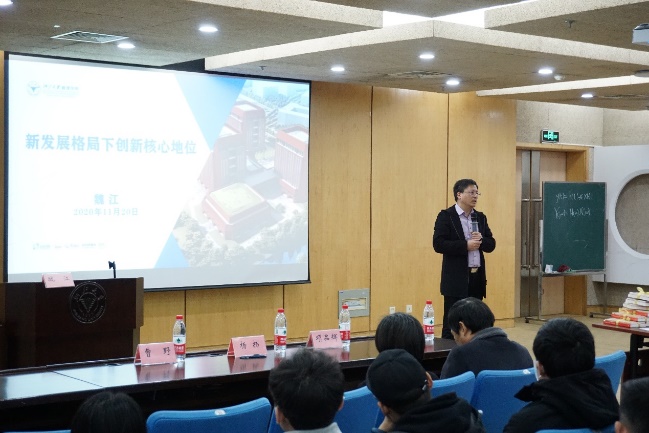 本次开班仪式特别邀请了浙江大学管理学院院长魏江教授为在场的师生党员作题为《新发展格局下创新核心地位》专题报告。魏教授从“十九届五中全会为什么提出以创新为核心地位”“我国的发展目前面临亟待解决的挑战与问题”以及“如何解决”三个方面展开详细全面的论述。他强调,作为大学生,尤其是作为浙江大学的学生,要正确认识新时代背景下创新的内涵,了解国内大循环、国际大循环和国际国内双循环的特点,并在此基础上要有大局意识、问题意识、忧患意识。此外魏教授还引导同学们主动思考在未来全球科技创新体系中,在中国现代化建设全局中,浙江大学的学生该扮演的角色定位。