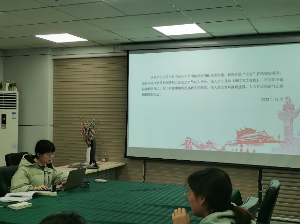 接下来冯雪同志进行微党课——全面依法治国的分享。冯雪同志重点介绍了全面依法治国重要论述、“七五”普法及依法治校三个内容。在依法治校这一部分,冯雪同志带大家深入学习贯彻《浙江大学章程》,不断提高依法治校的能力,着力构建中国特色现代大学制度。