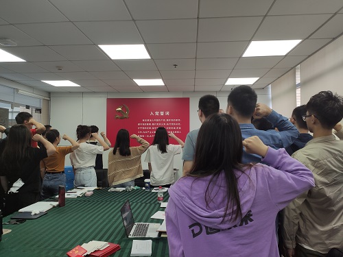 最后,由孙蕾同志领誓,全体党员在党旗前庄严宣誓,党员同志们不忘初心跟党走,牢记使命勇担当。