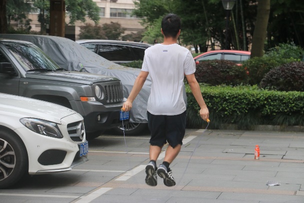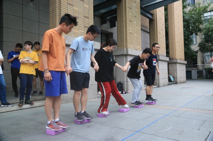 “摸石头过河”——泡沫板行进比赛更具有技巧,这项比赛看似简单,实则很考验大家对于一步跨多大的把握。不少组的同学由于太急于追求速度而多次违规导致加时。