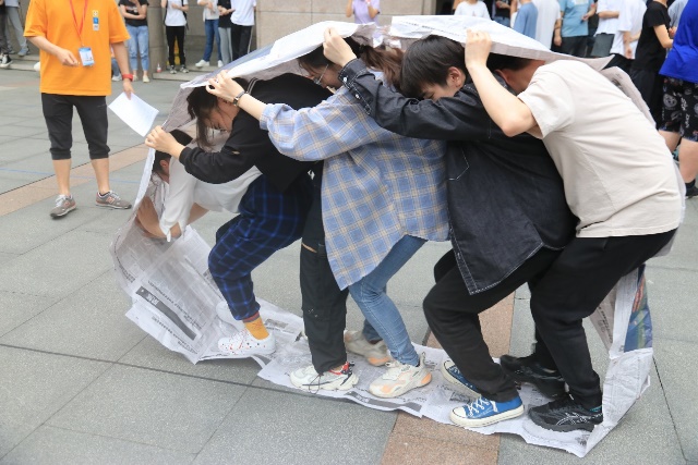 接着是“英雄坦克手”——无敌风火轮比赛。这项比赛中最有意思的地方在于,少用报纸可以减少比赛总耗时。大家纷纷减少报纸的用量,在“风火轮”中缩成一团,匍匐前进,参赛队员们努力在制作行进履带、团队匍匐前进中思考,努力将用时控制地最少。