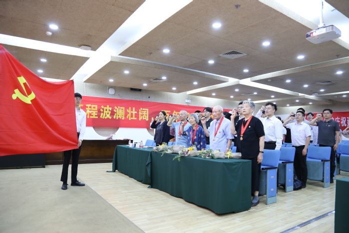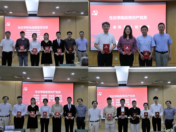 “七一”表彰环节,学院领导为老党员颁发了“光荣在党50年”纪念章,当前学院取得的各项显著成绩和育人成效,离不开一代代生仪人攻坚克难、自立自强的传承与拼搏,要向前辈学习、向老党员看齐,继承爱国奉献的优良传统,把服务国家作为最高追求,心怀“国之大者”,让红色基因代代相传。同时,还向2021年度生仪学院先进基层党支部、优秀共产党员、优秀党务工作者分别颁发了荣誉证书,向曾经辛勤服务在基层一线的离任党支部书记颁发纪念铭牌。