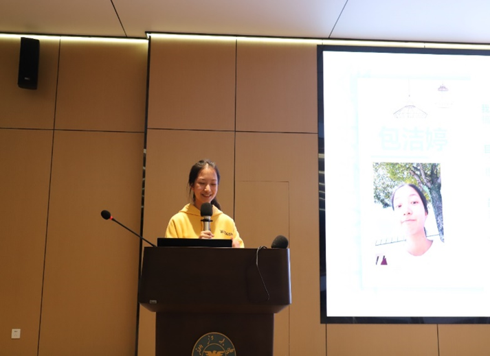 接下来是是学生会成员自我介绍的环节。按照综合事务部、学术文化部、文艺体育部的顺序,各部门成员依次进行自我介绍。大家先是用三个词概括了自己的特点,随后的介绍中,有的同学介绍了自己最喜欢的一句话,有的同学说出了自己的一些萌点,有的同学也展示出了自己给未来的自己的一些话。每一个同学的自我介绍都十分精彩,给在座的师生留下了深刻印象