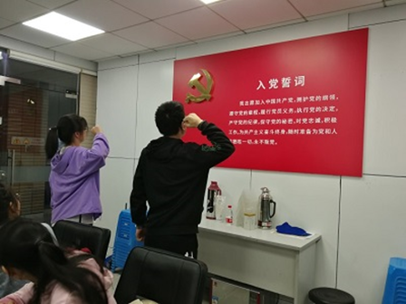会议第四项议程是接收预备党员,本次会议正式接收了苗萧梦和张心怡两位同志。表决通过后,老党员给两位新发展预备党员佩戴党徽,新发展预备党员进行了庄严的入党宣誓。