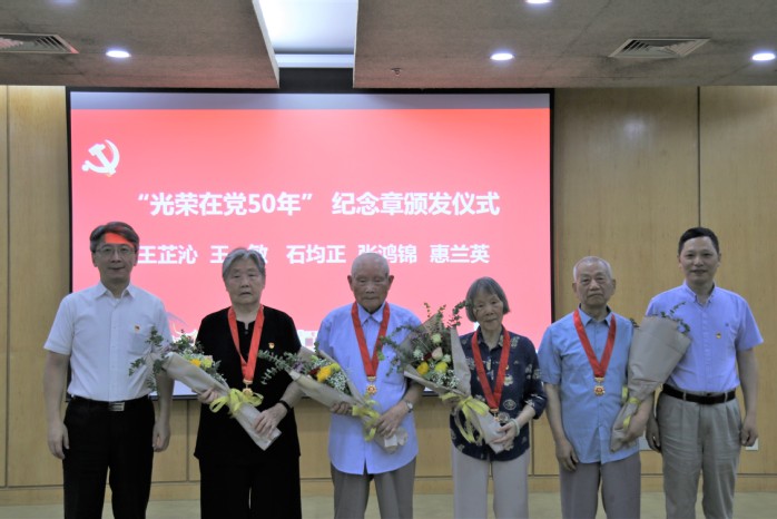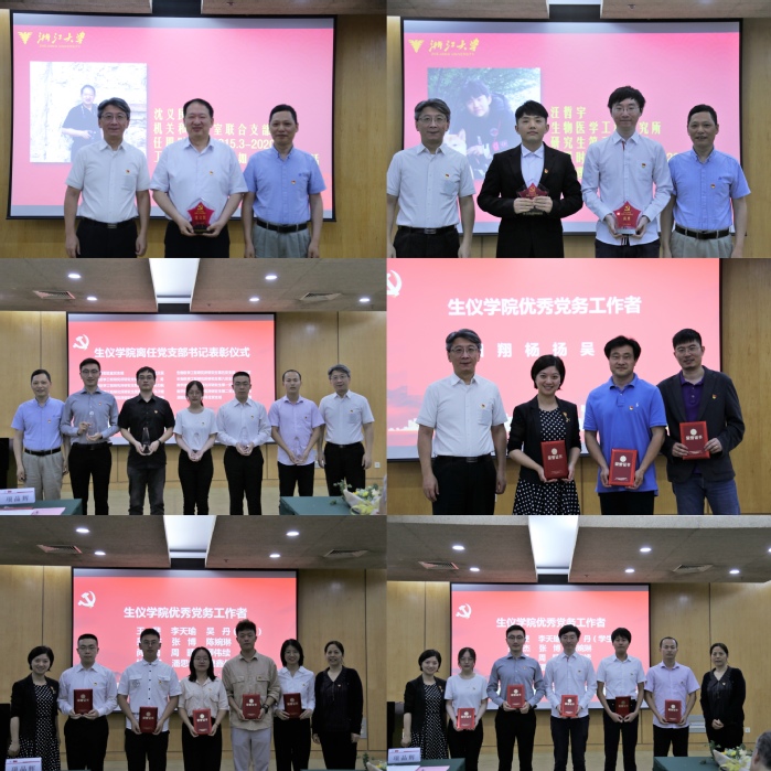 “七一”表彰环节,学院领导为老党员颁发了“光荣在党50年”纪念章,当前学院取得的各项显著成绩和育人成效,离不开一代代生仪人攻坚克难、自立自强的传承与拼搏,要向前辈学习、向老党员看齐,继承爱国奉献的优良传统,把服务国家作为最高追求,心怀“国之大者”,让红色基因代代相传。同时,还向2021年度生仪学院先进基层党支部、优秀共产党员、优秀党务工作者分别颁发了荣誉证书,向曾经辛勤服务在基层一线的离任党支部书记颁发纪念铭牌。