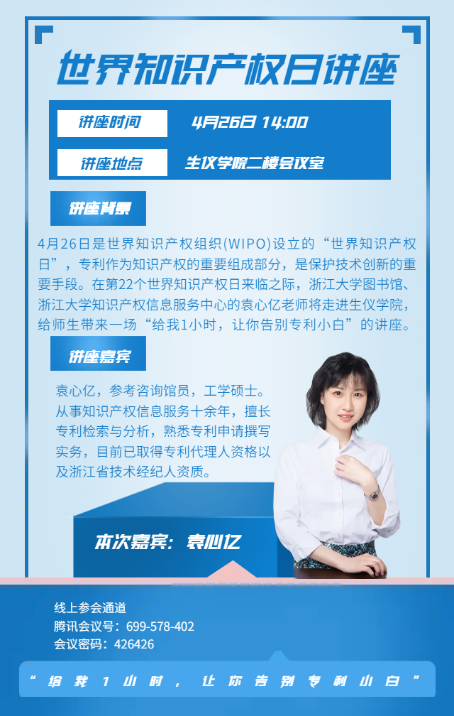 4月26日是世界知识产权组织(WIPO)设立的“世界知识产权日”,专利作为知识产权的重要组成部分,是保护技术创新的重要手段。在第22个世界知识产权日来临之际,浙江大学图书馆、浙江大学知识产权信息服务中心的袁心亿老师将走进生仪学院,给师生带来一场“给我1小时,让你告别专利小白”的讲座。