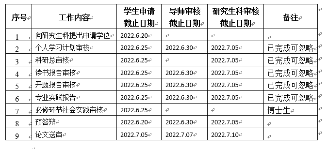 根据《浙江大学研究生学位申请实施办法(试行)》浙大发研〔2020〕45号及相关学位申请文件的要求,生仪学院决定于2022年7月10日前办理好2022年秋季(第三季)研究生学位申请者的学位申请确认手续,逾期不办理手续,表示自动放弃本次学位申请,进入延期毕业或结业。学位申请资格审核工作安排如下表: