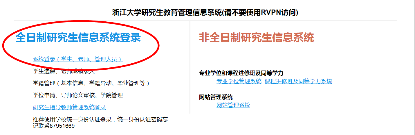 “研究生教育管理信息系统”网址:http://grs.zju.edu.cn/grsinfo.html左侧“全日制研究生信息系统登录”