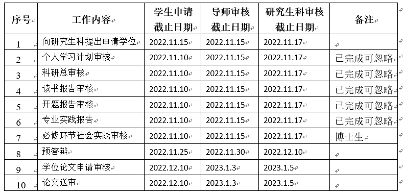 9、学位申请审核:上述1-8步骤按需全部完成,研究生于2022年12月20日前登录“研究生教育管理系统”的“我的学位申请”进入“信息录入”栏目,上传学位论文(送审评阅稿,PDF格式),还要完整准确地进行“论文及相关信息录入”和“学位上报相关信息录入”,其中教育部送审平台主要根据关键字和研究方向随机匹配评审专家,请务必准确关键字和研究方向。导师于2023年1月3日前审核通过,研究生科于2023年1月5日前审核通过。