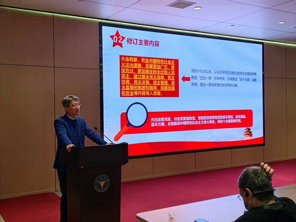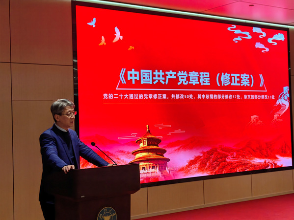 张宏院长首先向大家介绍了《中国共产党章程》的修订背景,向大家阐述了中国共产党自党的十九大以来取得的伟大成就,总结了以习近平同志为核心的党中央把马克思主义基本原理同中国具体实际相结合所提出的一系列治国理政的新理念、新思想、新战略,指出修订党章是深入学习贯彻党的创新理论的需要,是推进党和国家事业发展的需要,是深入推进新时代党的建设新的伟大工程的需要,是贯彻落实党的二十大精神的需要。