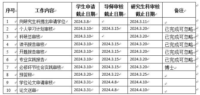 根据《浙江大学研究生学位申请实施办法(试行)》浙大发研〔2020〕45号及相关学位申请文件的要求,生仪学院决定于2024年3月8日前办理好2024年夏季(第二季)研究生学位申请确认手续,逾期不办理手续,表示自动放弃本次学位申请,进入延期毕业或结业。学位申请资格审核工作安排如下表: