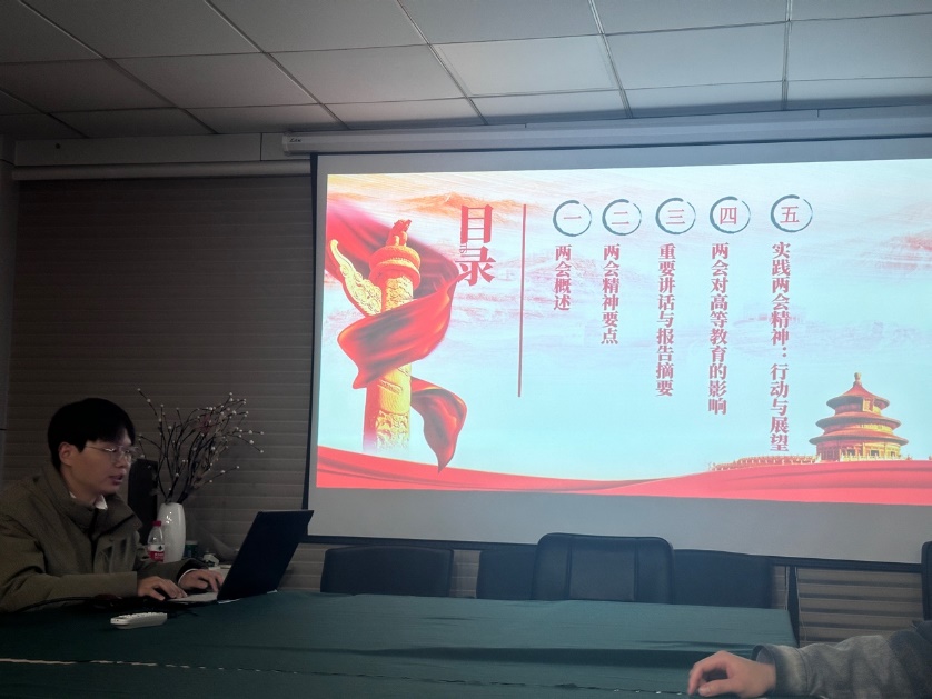 随后,支部党员黄霄同志为大家带来了一堂生动的《学习“两会”精神·共筑中国梦》主题党课。他从“两会”的概述与精神要点出发,深入解读了重要讲话与报告摘要,并结合高等教育的实际,探讨了“两会”精神对高等教育的影响以及实践“两会”两会精神的行动与展望。黄霄同志的讲解深入浅出,引发了党员们的深入思考。