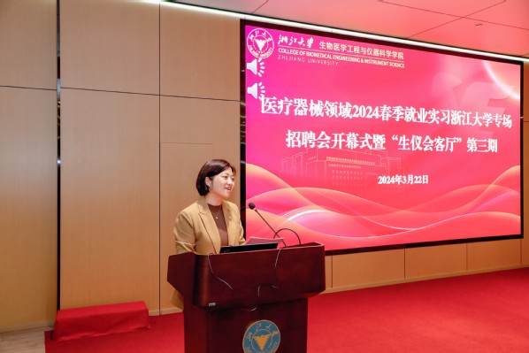 生机盎然迎春来,仪往无前建新功。2024年3月22日,医疗器械领域2024春季就业实习浙江大学专场招聘会暨“生仪会客厅”第三期活动在玉泉校区周亦卿楼顺利举办。医疗器械领域行业专家何涛、头部企业代表邵凌云校友、三甲医院代表俞刚校友受邀作主题分享,近四十家企事业单位来院布展招聘实习就业岗位。浙江大学就业指导中心副主任仇婷婷,生仪学院领导班子在杭全体成员,以及浙江大学医疗器械相关学科方向本研学生超百人参加活动。