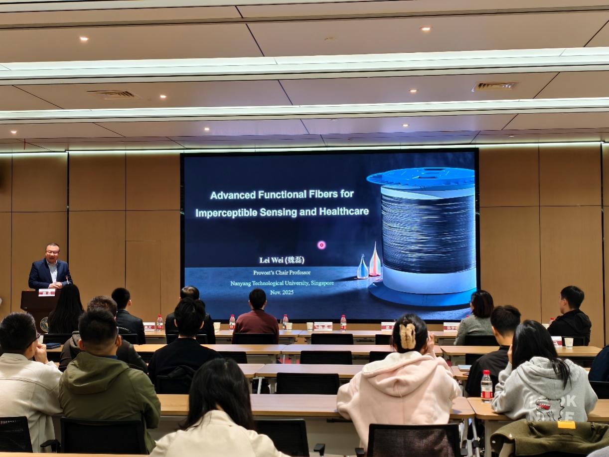 在题为Advanced Functional Fibers for lmperceptible Sensing and Healthcare的报告中,魏磊教授以独特的视角,带领师生们走进了智能织物的世界。他指出,作为日常生活中最易被忽视的“材料”,织物正被重新定义——它可以被设计为具有感知、发电与控温能力的智能服装,而其核心在于“功能性纤维”的设计与制造。