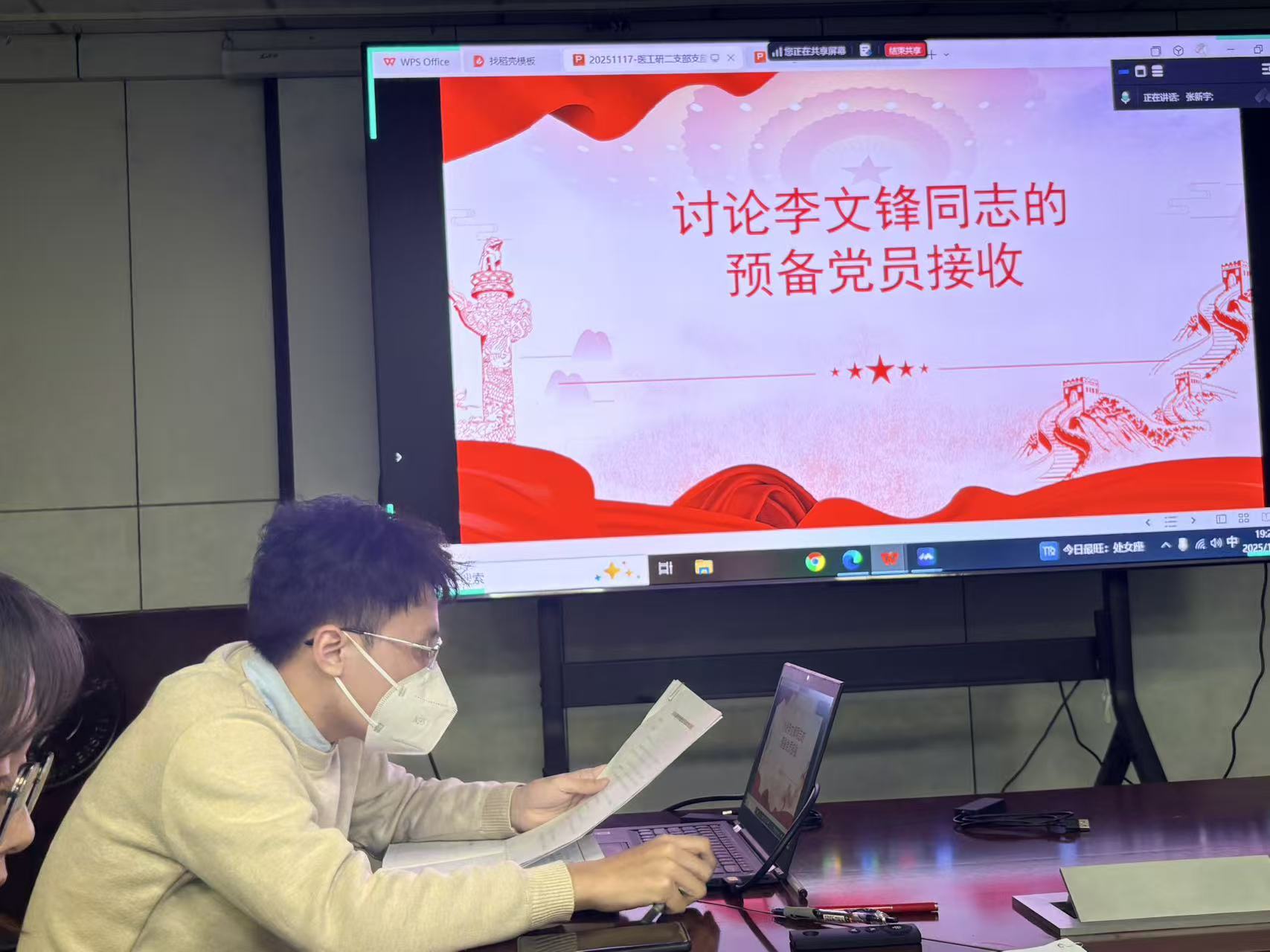 会议第三项,党支部就李文峰同志的发展问题开展研究讨论。支部根据前期培养教育和考察情况,认真听李文峰同志的入党志愿,与会党员对其政治立场、理论学习、日常表现和群众基础进行了充分讨论并进行表决。经研究和全体与会的党员投票决定,支部同意将李文峰同志接收为预备党员。