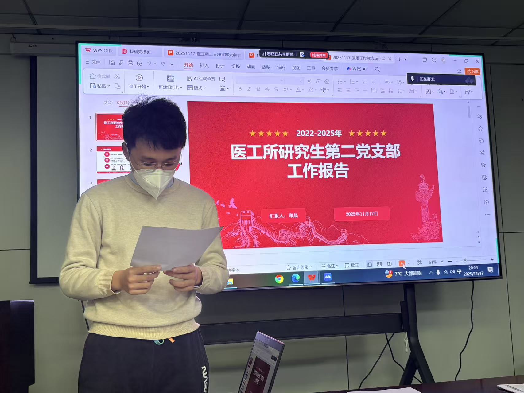 2025年11月17日晚上19:00,浙江大学生仪学院医工所第二党支部在玉泉校区周亦卿科技大楼四楼会议室召开11月支部会议。本次会议由党支部书记郑晟同志主持,会议由樊易美同志分享二十届四中全会精神,党员集中大课基本培训与心得交流、发展对象讨论以及支委工作汇报与换届选举五项内容展开。