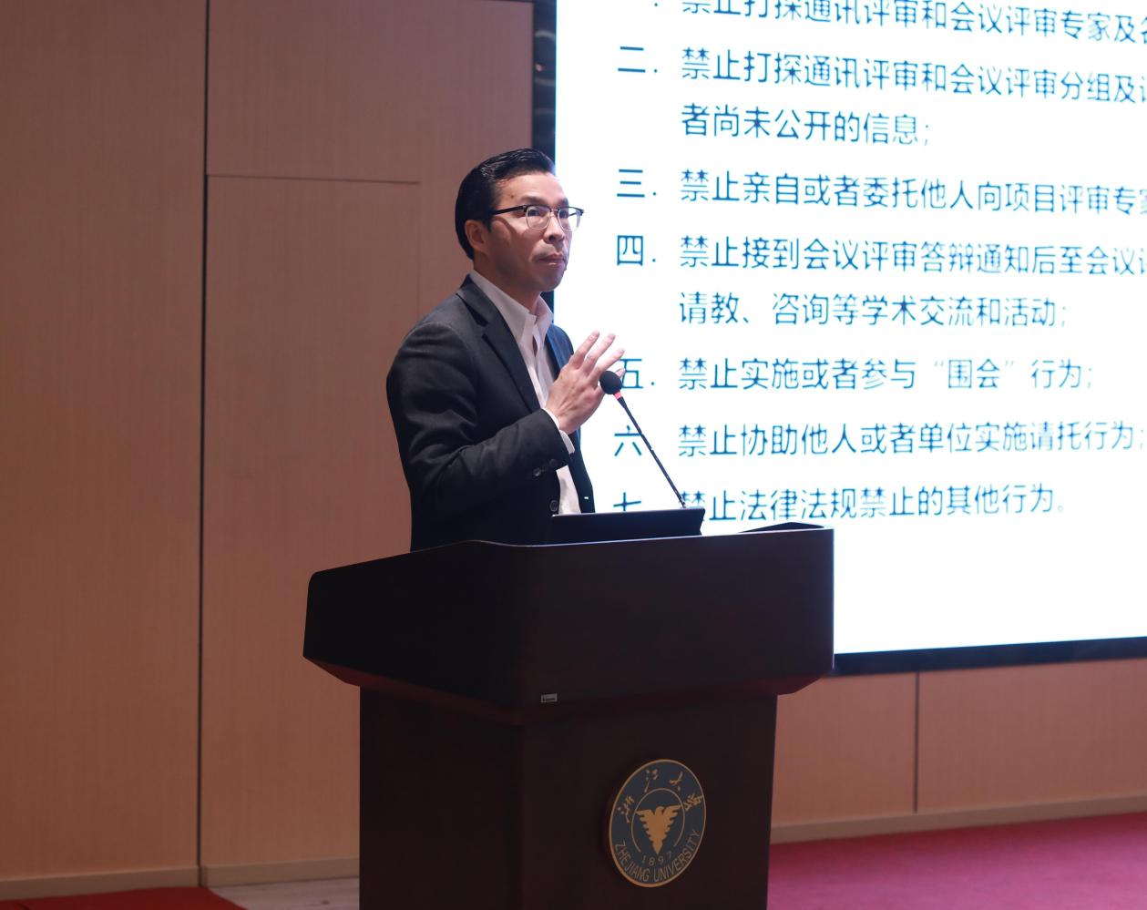 为深入贯彻落实学校关于科研诚信建设国家自然科学基金项目申报工作的总体部署进一步营造风清气正、求真务实积极进取的学术生态,同时充分调动广大教师,特别是青年教师的申报积极性,切实提升项目申报质量与成功率,生仪学院20251218组织召开科研诚信专题宣贯暨2026年度国家自然科学基金项目申报组织动员会浙大陈廷骅大健康学院执行院长陈光弟、浙大科学技术研究院前沿基础部副部长薛建龙、学院党委副书记副院长刘华锋、副院长林辉、副院长吴丹以及学院教师参加了本次会议。会议由林辉副院长主持。