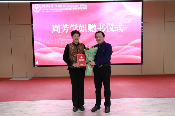 会上浙江大学95级硕士研究生校友、宁波新芝生物科技有限公司董事长周芳学姐向学院赠书,为本次座谈会增添了浓厚的情谊色彩。